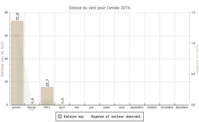 | janvier | -0.8 °C | 6.0 °C | 16.2 °C | 11.8 °C | 8.7 °C | 1.2 km/h | 72.9 km/h | NNO |
